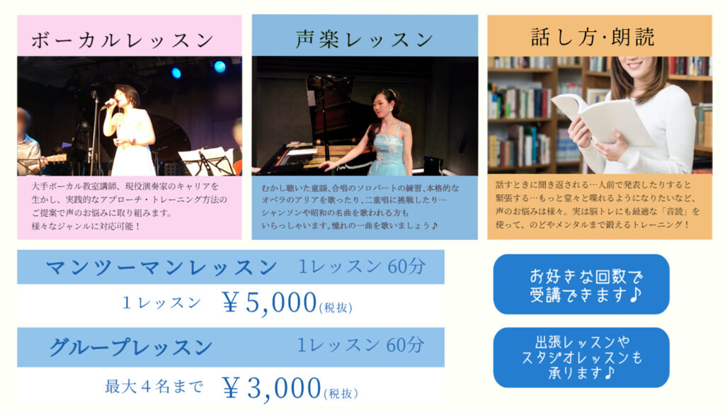 + 大阪北摂、京都市内、滋賀草津あたりまで出張レッスンを行っており、ご希望の場合交通費をご負担いただく場合がございます。レッスン場所はご自宅、または近隣スタジオ・カラオケボックスなど